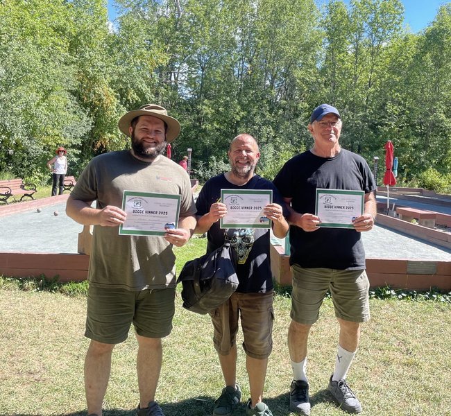 The 2025 State Singles Bocce Tournament was a marathon event. On Saturday 8/30, twenty-six players started the play, and several hours later, heavy rain made the courts unplayable. Players showed up again Sunday morning to continue play, although a few had to forfeit due to other commitments.